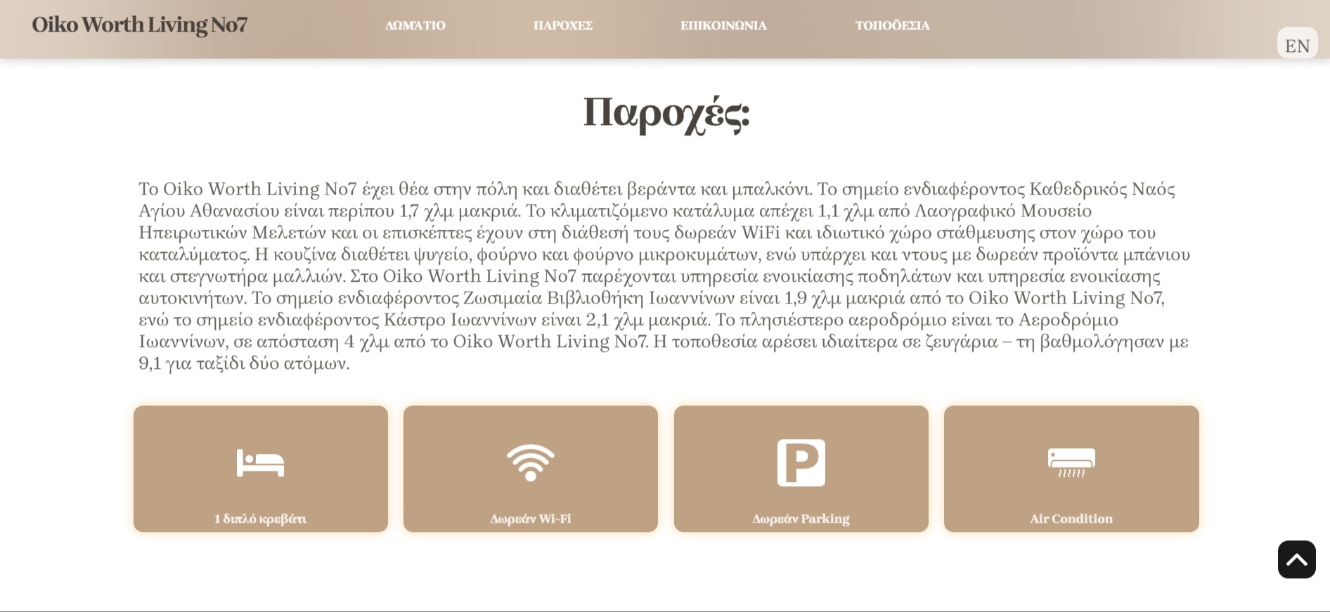 Minimal and easy-to-navigate website design, presenting the "Oiko Worth Living" apartment in Ioannina, Greece. The design aims to help the visitors find easily every piece of information they need, inside a beautiful web page. The inforamtion displayed about the appartment include high quality pictures, the appartment's facilities, booking information and navigation instructions. The colors used in the design are soft and warm in order to match the appartment's atmosphere and create a final image that inspires homogeneity and harmony.